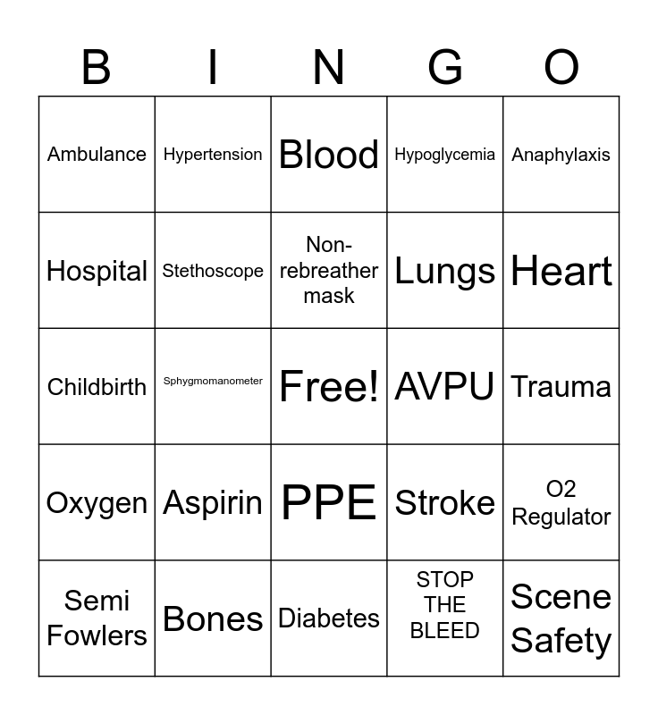 This bingo card has a free space and 29 words: Semi Fowlers, Auscultate, Sphygmomanometer, Pulse, Ambulance, Blood, Stethoscope, Aspirin, AVPU, Bones, Trauma, Scene Safety, Diabetes, STOP THE BLEED, Heart, SAMPLE, PPE, Oxygen, Anaphylaxis, Childbirth, Stroke, AMI, Lungs, Hospital, Hypoglycemia, Hypertension, O2 Regulator, Non-rebreather mask and Nasal cannula.