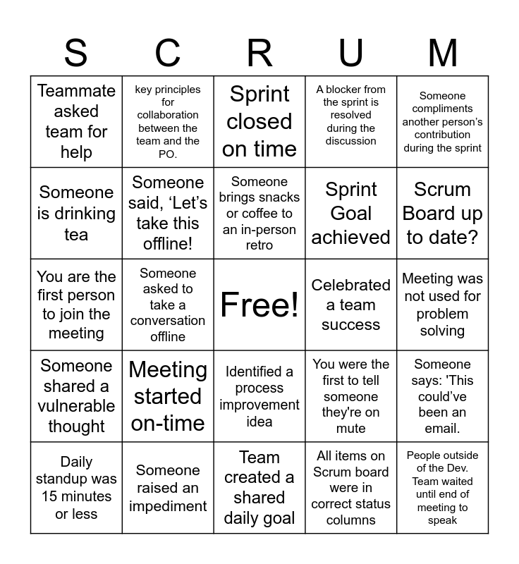 This bingo card has a free space and 29 words: Daily standup was 15 minutes or less, Sprint Goal was discussed, Someone asked to take a conversation offline, Team planned a collaboration session, Teammate asked team for help, Sprint closed on time, Someone said, ‘Let’s take this offline!, Meeting started on-time, Celebrated a team success, Someone raised an impediment, Meeting was not used for problem solving, People outside of the Dev. Team waited until end of meeting to speak, Team created a shared daily goal, All items on Scrum board were in correct status columns, Scrum Board up to date?, Everyone rated the sprint a 3 or higher in team morale, Identified a process improvement idea, Someone shared a vulnerable thought, Someone compliments another person’s contribution during the sprint, You are the first person to join the meeting, You were the first to tell someone they're on mute, Someone is drinking coffee, Sprint Goal achieved, Someone is drinking tea, A blocker from the sprint is resolved during the discussion, key principles for collaboration between the team and the PO., Someone says: 'This could’ve been an email., Someone brings snacks or coffee to an in-person retro and The session goes slightly off-topic but leads to a good laugh..