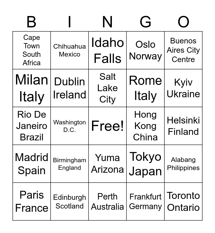 This bingo card has a free space and 24 words: Birmingham England, Edinburgh Scotland, Salt Lake City, Paris France, Buenos Aires City Centre, Cape Town South Africa, Milan Italy, Chihuahua Mexico, Hong Kong China, Yuma Arizona, Rome Italy, Rio De Janeiro Brazil, Tokyo Japan, Alabang Philippines, Dublin Ireland, Frankfurt Germany, Helsinki Finland, Idaho Falls, Kyiv Ukraine, Washington D.C., Toronto Ontario, Madrid Spain, Oslo Norway and Perth Australia.