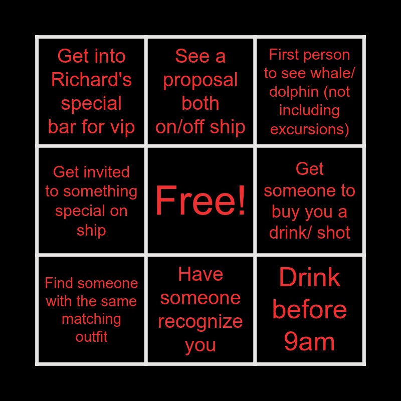 This bingo card has a free space and 8 words: Get someone to buy you a drink/ shot, First person to see whale/ dolphin (not including excursions), See a proposal both on/off ship, Find someone with the same matching outfit, Get into Richard's special bar for vip, Drink before 9am, Get invited to something special on ship and Have someone recognize you.