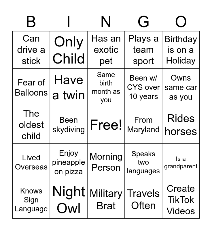 This bingo card has a free space and 24 words: Knows Sign Language, Enjoy pineapple on pizza, Same birth month as you, Travels Often, Birthday is on a Holiday, Can drive a stick, Only Child, Has an exotic pet, From Maryland, Rides horses, The oldest child, Have a twin, Speaks two languages, Is a grandparent, Fear of Balloons, Night Owl, Military Brat, Plays a team sport, Owns same car as you, Lived Overseas, Been skydiving, Morning Person, Been w/ CYS over 10 years and Create TikTok Videos.