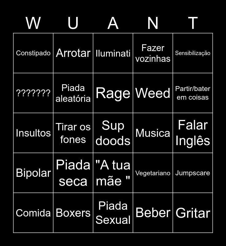 This bingo card has a free space and 36 words: Bom, Bolt, Piada controversa, Piada aleatória, Vegetariano, Bipolar, Rage, Mexer no cabelo, Sensibilização, Barriga/gordo, Tirar os fones, Fazer vozinhas, Azeiteiro, Musica, Partir/bater em coisas, Constipado, Afastar da camera, Piada seca, Gritar, Iluminati, Falar Inglês, Jumpscare, Boxers, Comida, Piada Sexual, Arrotar, Insultos, Rouco, Weed, ???????, Sensualizar, Artigo 13, Beber, "A tua mãe ", Star wars and Pewdiepie.