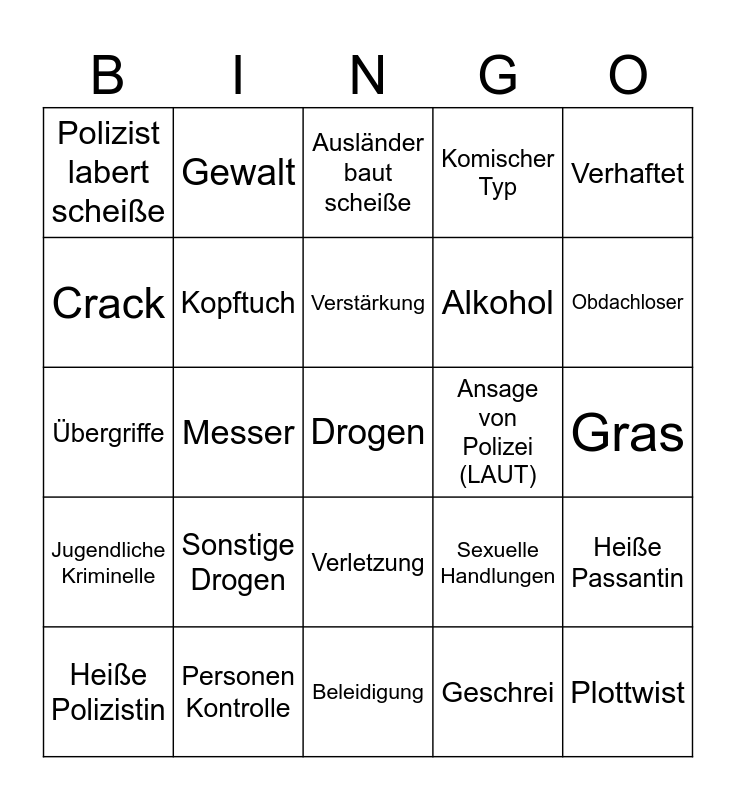 This bingo card has a free space and 24 words: Sonstige Drogen, Personen Kontrolle, Verstärkung, Heiße Polizistin, Verhaftet, Polizist labert scheiße, Crack, Gewalt, Ansage von Polizei (LAUT), Verletzung, Alkohol, Übergriffe, Sexuelle Handlungen, Heiße Passantin, Kopftuch, Geschrei, Gras, Ausländer baut scheiße, Obdachloser, Messer, Plottwist, Jugendliche Kriminelle, Komischer Typ and Beleidigung.