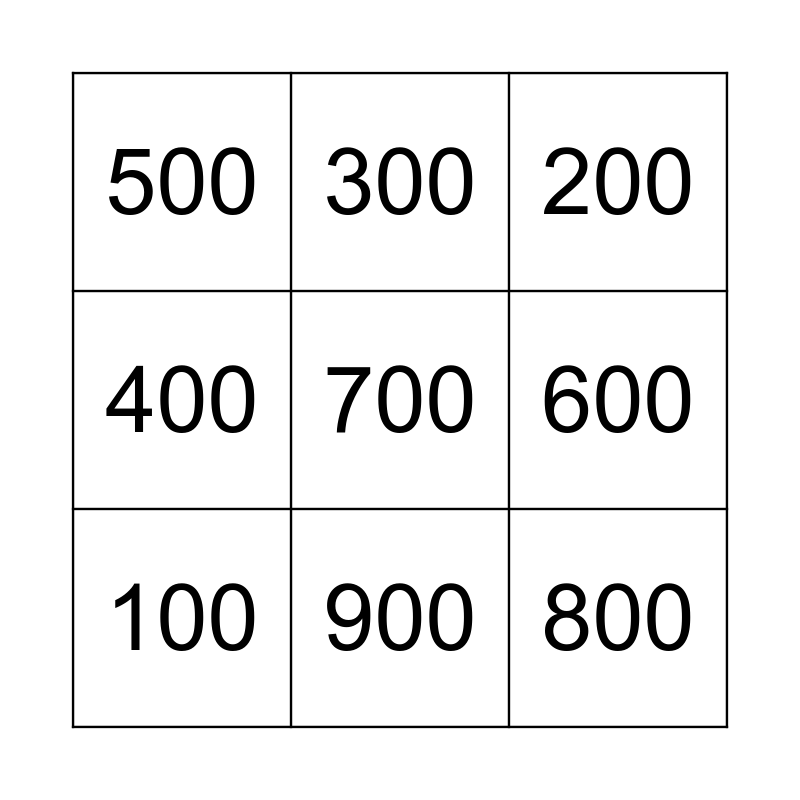 This bingo card has 9 words: 100, 200, 300, 400, 500, 600, 700, 800 and 900.