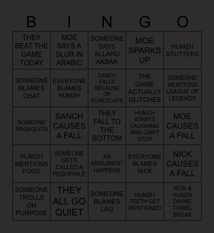 This bingo card has 25 words: SOMEONE GETS CALLED A PEDOPHILE, SOMEONE BLAMES LAG, SANCH FALLS BECAUSE OF RUNESCAPE, SOMEONE TROLLS ON PURPOSE, HUMZH STUTTERS, THEY BEAT THE GAME TODAY, SOMEONE BLAMES CHAT, MOE SAYS A SLUR IN ARABIC, HUMZH STARTS LAUGHING AND CAN'T STOP, AN ARGUMENT HAPPENS, THE GAME ACTUALLY GLITCHES, SOMEONE RAGEQUITS, EVERYONE BLAMES NICK, NICK CAUSES A FALL, EVERYONE BLAMES HUMZH, NICK & HUMZH DIVINE TOWEL BREAK, MOE CAUSES A FALL, SOMEONE SAYS ALLAHU AKBAR, SOMEONE MENTIONS LEAGUE OF LEGENDS, SANCH CAUSES A FALL, THEY FALL TO THE BOTTOM, THEY ALL GO QUIET, HUMZH MENTIONS FOOD, MOE SPARKS UP and HUMZH TEETH GET MENTIONED.