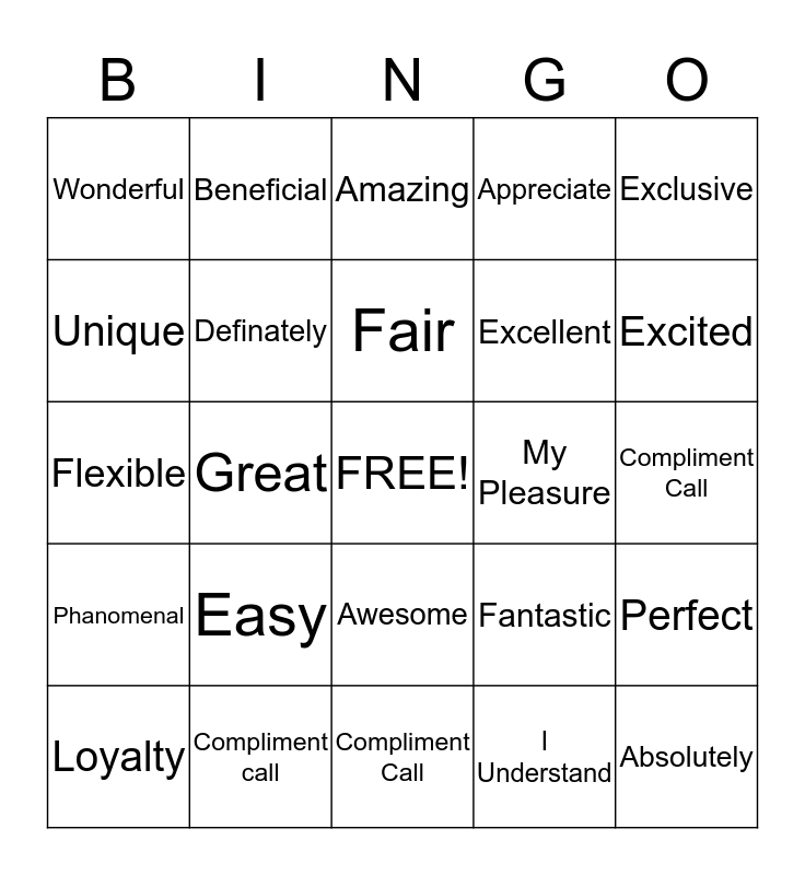 This bingo card has a free space and 24 words: Easy, Compliment call, Fair, Loyalty, Exclusive, Wonderful, Unique, Beneficial, My Pleasure, Awesome, Excellent, Flexible, Fantastic, Perfect, Definately, I Understand, Compliment Call, Amazing, Excited, Great, Absolutely, Phanomenal, Appreciate and Compliment Call.