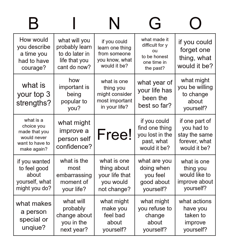 This bingo card has a free space and 24 words: what is the most embarrassing moment of your life?, what will probably change about you in the next year?, what is one thing you might consider most important in your life?, what makes a person special or unqiue?, if you could forget one thing, what would it be?, How would you describe a time you had to have courage?, what is your top 3 strengths?, what will you probably learn to do later in life that you cant do now?, if you could find one thing you lost in the past, what would it be?, what is one thing about your life that you would not change?, what year of your life has been the best so far?, what is a choice you made that you would never want to have to make again?, what are you doing when you feel good about yourself?, what is one thing you would like to improve about yourself?, how important is being popular to you?, what might you refuse to change about yourself?, if one part of you had to stay the same forever, what would it be?, if you could learn one thing from someone you know, what would it be?, what might you be willing to change about yourself?, what might improve a person self confidence?, what actions have you taken to improve yourself?, if you wanted to feel good about yourself, what might you do?, what made it difficult for you to be honest one time in the past? and what might make you feel bad about yourself?.