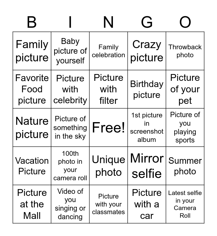 This bingo card has a free space and 24 words: 100th photo in your camera roll, Video of you singing or dancing, Picture with filter, Picture at the Mall, Throwback photo, Family picture, Favorite Food picture, Baby picture of yourself, 1st picture in screenshot album, Unique photo, Birthday picture, Nature picture, Mirror selfie, Summer photo, Picture with celebrity, Picture with a car, Picture of you playing sports, Family celebration, Picture of your pet, Picture of something in the sky, Latest selfie in your Camera Roll, Vacation Picture, Crazy picture and Picture with your classmates.