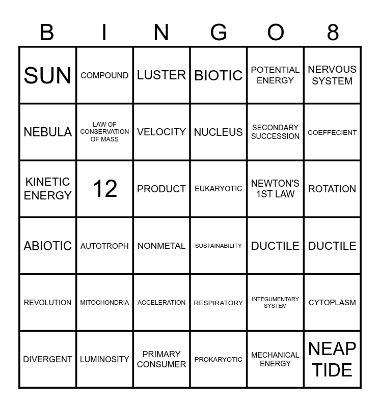 This bingo card has 53 words: CONVERGENT, KINETIC ENERGY, CONDUCTOR, DUCTILE, NEWTON'S 1ST LAW, MECHANICAL ENERGY, COMPOUND, CELL MEMBRANE, NERVOUS SYSTEM, NEAP TIDE, NEBULA, PRIMARY CONSUMER, AUTOTROPH, ABIOTIC, REACTANT, NONMETAL, LAW OF CONSERVATION OF MASS, 12, Free!, POTENTIAL ENERGY, COEFFECIENT, REVOLUTION, VELOCITY, SUN, MALLEABLE, SUSTAINABILITY, INTEGUMENTARY SYSTEM, NEWTON'S 3RD LAW, RESPIRATORY, NUCLEUS, PRIMARY SUCCESSION, LUMINOSITY, CONVECTION CURRENT, CELL THEORY, PROKARYOTIC, CYTOPLASM, BIOTIC, DUCTILE, LUSTER, NEWTON'S 2ND LAW, METAL, SPRING TIDE, PRODUCT, 10, SUBSCRIPT, ROTATION, ACCELERATION, DIVERGENT, SECONDARY SUCCESSION, EUKARYOTIC, RIBOSOME, MITOCHONDRIA and ASEXUAL.