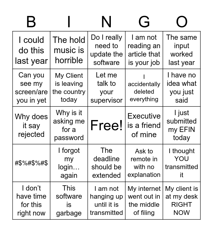 This bingo card has a free space and 73 words: Need an override code, Today is the deadline, I could do this last year, Can you walk me through how to efile, CA and need an efin, I need to purchase an efile license, #$%#$%#$, I want to talk to an expert, Ask to remote in with no explanation, It shouldn't be that hard to change the program, Group of intoxicated client, Letter of abatement, My Client is leaving the country today, I just submitted my EFIN today, I want to talk to someone that is going to fix this now, The hold music is horrible, I am not hanging up until it is transmitted, Can you see my screen/are you in yet, Someone called because boss told them to, but can't open a tax return and make input, Executive is a friend of mine, Let me talk to your supervisor, I am not reading an article that is your job, The same input worked last year, I didn't have to do this last year, I don’t have time for this right now, This is costing me money, It’s just spinning—nothing is happening, Can you just do it for me, I’ve been on hold forever, Your system kicked me out again, This software is garbage, Can I speak to someone in America, I already explained this to the last person, I’m not tech savvy, Why is it asking me for a password, My computer just shut off, I need this fixed yesterday, I don’t trust the cloud, My client is at my desk RIGHT NOW, I didn’t know there was an update, My internet went out in the middle of filing, I forgot my login… again, It’s April 15th—why are your lines busy, The return disappeared, It won’t let me click next, I accidentally deleted everything, Do I really need to update the software, It was working five minutes ago, I’ve been doing this for 30 years, Why does it say rejected, I need to file for all 50 states, I didn’t back anything up, What do you mean it's not compatible with Windows 7, This is a disaster, I only have 10 minutes, I have clients waiting, I'm using my nephew's computer, The deadline should be extended, Why do I need a security question, I’m in a hotel lobby doing this, Can you resend that email for the 4th time, My EFIN is still pending, My mouse just stopped working, I have no idea what you just said, Wait, there’s a new form, I already paid—why is it asking again, I don’t trust that error message, What’s the fastest way to fix this, I thought YOU transmitted it, Can you just remote in and fix it, My accountant told me to call you, This worked on my old laptop and Your system made me late.