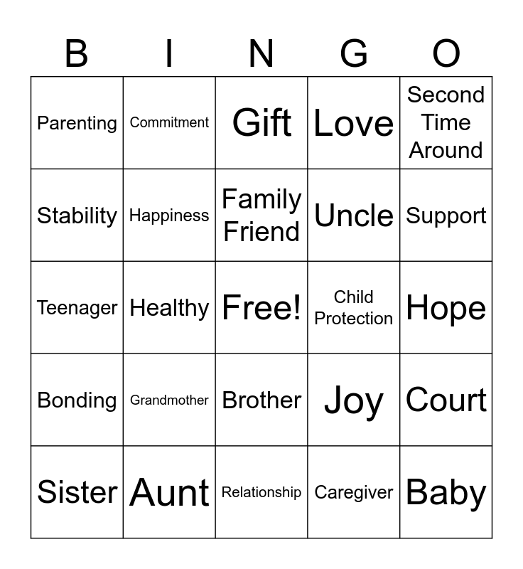 This bingo card has a free space and 24 words: Grandmother, Aunt, Family Friend, Sister, Second Time Around, Parenting, Stability, Commitment, Child Protection, Brother, Uncle, Teenager, Joy, Court, Happiness, Caregiver, Hope, Gift, Support, Healthy, Baby, Bonding, Love and Relationship.