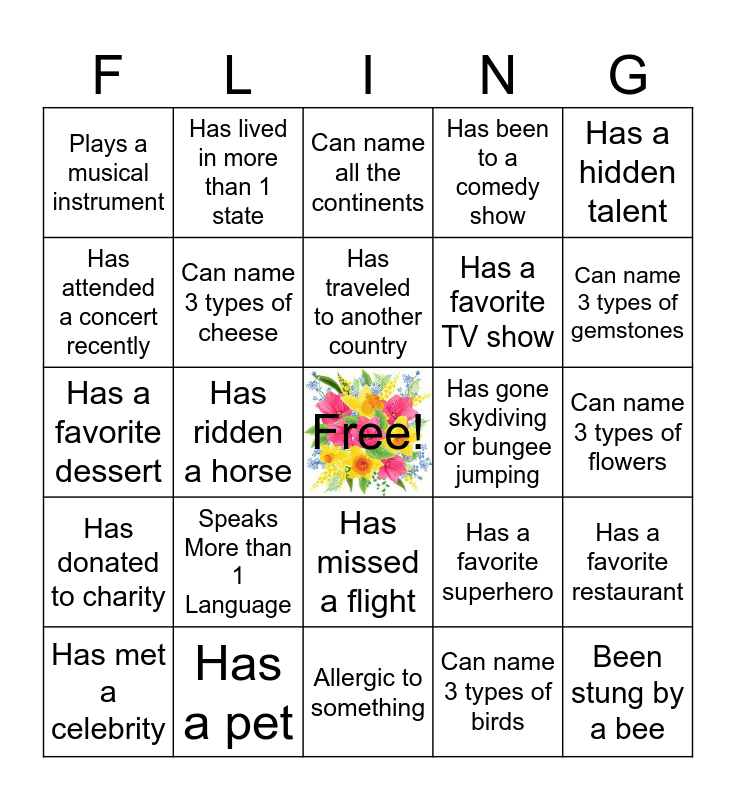 This bingo card has a free space and 24 words: Speaks More than 1 Language, Has a pet, Has traveled to another country, Has met a celebrity, Has a hidden talent, Plays a musical instrument, Has attended a concert recently, Has lived in more than 1 state, Has gone skydiving or bungee jumping, Has missed a flight, Has a favorite TV show, Has a favorite dessert, Has a favorite superhero, Has a favorite restaurant, Can name 3 types of cheese, Can name 3 types of birds, Can name 3 types of flowers, Can name all the continents, Can name 3 types of gemstones, Has ridden a horse, Been stung by a bee, Has donated to charity, Has been to a comedy show and Allergic to something.