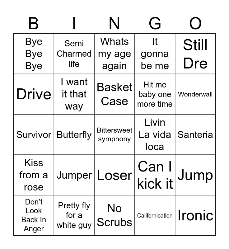 This bingo card has 55 words: All Star, Don’t Look Back In Anger, Whatta Man, Bye Bye Bye, No Scrubs, What a girl wants, I want it that way, Say my name, Hit me baby one more time, Miami, It gonna be me, Waterfalls, Doo wop, Gettin jiggy with if, Mambo #5, Wannabe, Still Dre, Butterfly, All the small things, Bittersweet symphony, Livin La vida loca, My heart will go o], Can I kick it, Whats my age again, It wasnt me, Basket Case, Californication, Knockin in Heavans door, Santeria, Jump, What a girl wants, Insane in the brain, If I ruled the world, Still not a player, Drive, Survivor, Killing me softly with his song, Kiss from a rose, Ironic, One week, Semi Charmed life, Ice Ice Baby, Kryptonite, Barbie Girl, Jumper, Pretty fly for a white guy, Party up (up in here), Baby got back, Ill make love to you, Wonderwall, Basket case, Friends in low places, Jump around, Loser and What I got.