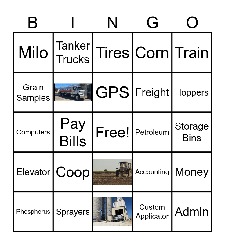 This bingo card has 3 images, a free space and 21 words: Coop, Sprayers, GPS, Phosphorus, Train, Milo, Grain Samples, Tanker Trucks, Petroleum, Freight, Computers, Accounting, Money, Custom Applicator, Storage Bins, Tires, Hoppers, Pay Bills, Admin, Elevator and Corn.