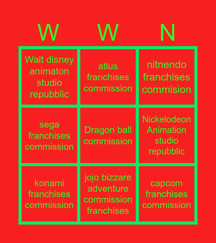 This bingo card has a free space and 8 words: Nickelodeon Animation studio repubblic, nitnendo franchises commision, atlus franchises commission, konami franchises commission, Walt disney animaton studio repubblic, capcom franchises commission, sega franchises commission and jojo bizzare adventure commission franchises.
