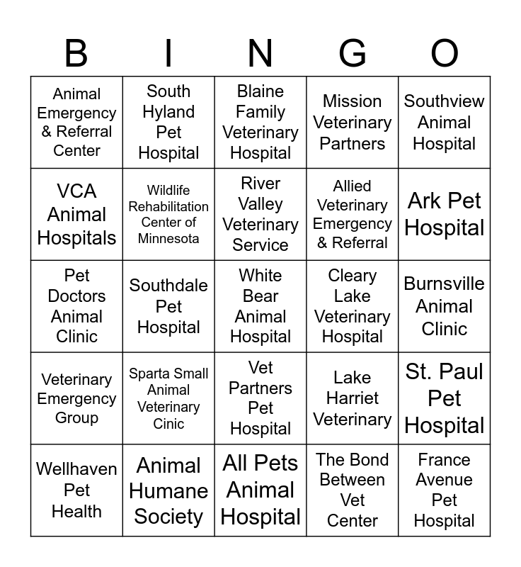This bingo card has 40 words: Blue Pearl Pet Hospital, Pet Doctors Animal Clinic, U of M - Research Animal Resources, Wildlife Rehabilitation Center of Minnesota, Animal Humane Society, Vet Partners Pet Hospital, River Valley Veterinary Service, Hometown Veterinary Partners, Southview Animal Hospital, Veterinary Emergency Group, Southdale Pet Hospital, Mission Veterinary Partners, White Bear Animal Hospital, Burnsville Animal Clinic, Cleary Lake Veterinary Hospital, Sparta Small Animal Veterinary Cinic, Meadow View Veterinary Clinic, Animal Emergency & Referral Center, Heartland Animal Hospital, Blaine Family Veterinary Hospital, St. Paul Pet Hospital, The Bond Between Vet Center, Allied Veterinary Emergency & Referral, VCA Animal Hospitals, U of M Veterinary Medical Center, Lakefield Veterinary Group, Shamrock Animal Hospital, Bush Lake Pet Hospital, France Avenue Pet Hospital, Stillwater Veterinary Clinic, Lakeville Family Pet Clinic, Wellhaven Pet Health, Mission Animal Hospital, Lake Harriet Veterinary, Ark Pet Hospital, All Pets Animal Hospital, Banfield Pet Hospital, Lexington Pet Clinic, South Hyland Pet Hospital and Akin Hills Pet Hospital.