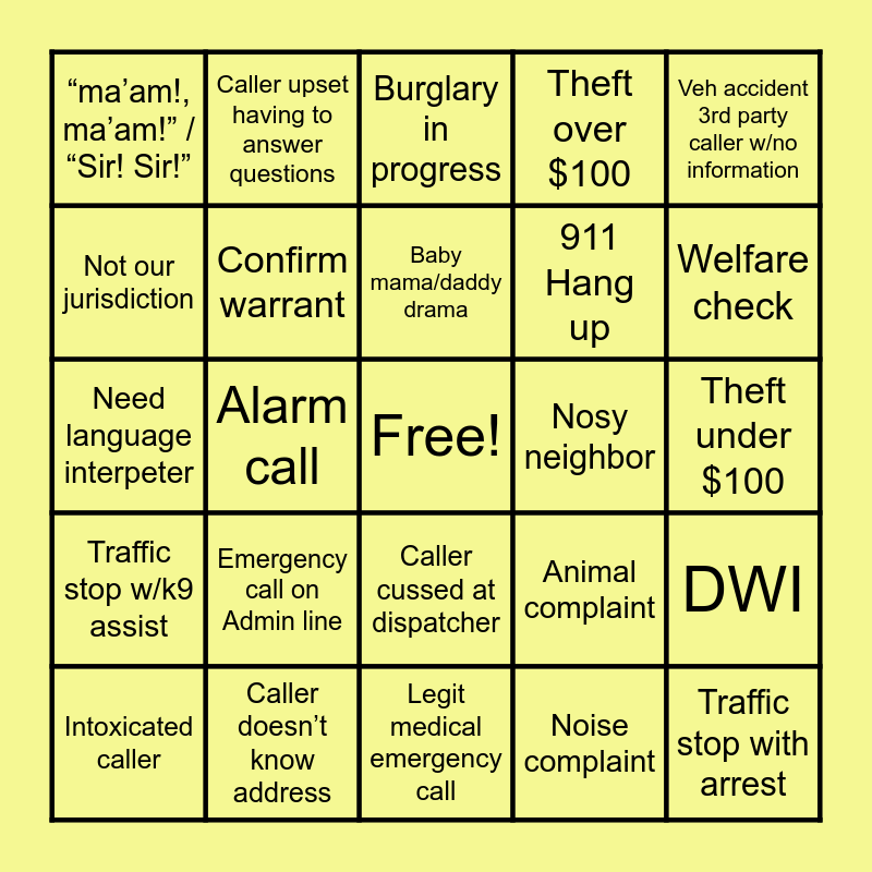 This bingo card has a free space and 24 words: Emergency call on Admin line, Caller doesn’t know address, Baby mama/daddy drama, Intoxicated caller, Veh accident 3rd party caller w/no information, “ma’am!, ma’am!” / “Sir! Sir!”, Not our jurisdiction, Caller upset having to answer questions, Nosy neighbor, Caller cussed at dispatcher, 911 Hang up, Need language interpeter, Animal complaint, DWI, Confirm warrant, Noise complaint, Theft under $100, Burglary in progress, Welfare check, Alarm call, Traffic stop with arrest, Traffic stop w/k9 assist, Theft over $100 and Legit medical emergency call.