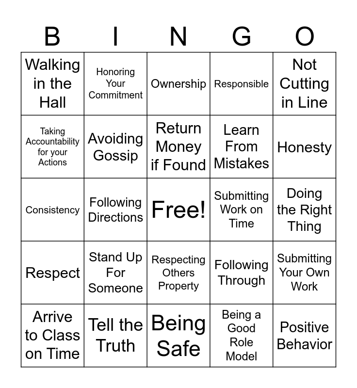 This bingo card has a free space and 24 words: Stand Up For Someone, Tell the Truth, Return Money if Found, Arrive to Class on Time, Not Cutting in Line, Walking in the Hall, Taking Accountability for your Actions, Honoring Your Commitment, Submitting Work on Time, Respecting Others Property, Learn From Mistakes, Consistency, Following Through, Submitting Your Own Work, Avoiding Gossip, Being a Good Role Model, Doing the Right Thing, Ownership, Honesty, Following Directions, Positive Behavior, Respect, Responsible and Being Safe.