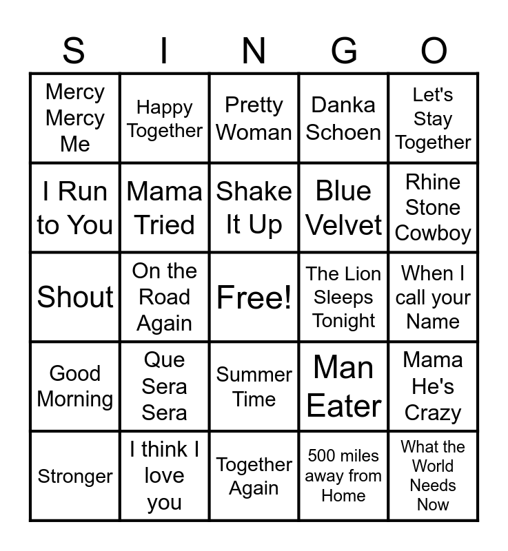 This bingo card has a free space and 29 words: Stronger, Coal Miner's Daughter, On the Road Again, Funny Girl, Mercy Mercy Me, Pretty Woman, Mama Tried, Que Sera Sera, The Lion Sleeps Tonight, I think I love you, When I call your Name, What the World Needs Now, Together Again, 500 miles away from Home, Rhine Stone Cowboy, Tip Toe Thru the Tulips, Summer Time, Good Morning, Let's Stay Together, Shout, Man Eater, Mamma Mia, Blue Velvet, I Run to You, Danka Schoen, Happy Together, Mama He's Crazy, Shake It Up and The Weight.