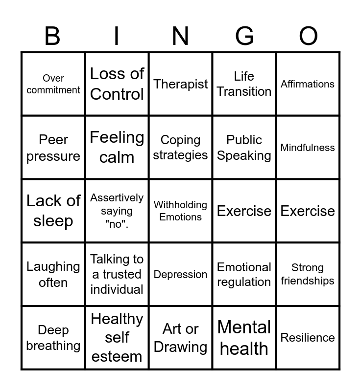 This bingo card has a free space and 29 words: Deep breathing, Journaling, Assertively saying "no"., Anxiety, Over commitment, Therapist, Feeling calm, Talking to a trusted individual, Exercise, Healthy self esteem, Exercise, Resilience, Art or Drawing, Mental health, Mindfulness, Too much homework, Depression, Laughing often, Affirmations, Lack of sleep, Emotional regulation, Self care, Public Speaking, Peer pressure, Life Transition, Loss of Control, Strong friendships, Coping strategies and Mental health day.