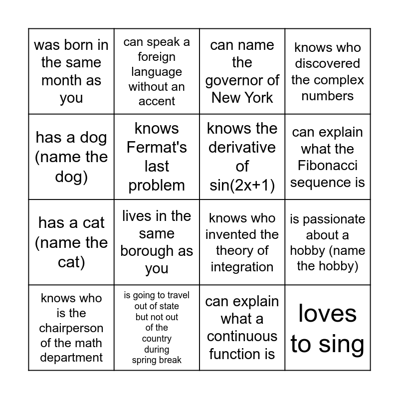 This bingo card has 16 words: is going to travel out of state but not out of the country during spring break, is passionate about a hobby (name the hobby), can name the governor of New York, was born in the same month as you, has a cat (name the cat), can speak a foreign language without an accent, knows who invented the theory of integration, can explain what a continuous function is, has a dog (name the dog), knows Fermat's last problem, knows who is the chairperson of the math department, knows who discovered the complex numbers, lives in the same borough as you, can explain what the Fibonacci sequence is, knows the derivative of sin(2x+1) and loves to sing.