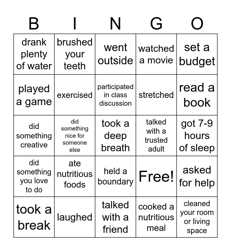 This bingo card has 25 words: ate nutritious foods, talked with a friend, participated in class discussion, took a break, set a budget, drank plenty of water, played a game, brushed your teeth, talked with a trusted adult, held a boundary, stretched, did something creative, Free!, asked for help, exercised, cleaned your room or living space, got 7-9 hours of sleep, went outside, read a book, did something nice for someone else, took a deep breath, laughed, did something you love to do, watched a movie and cooked a nutritious meal.