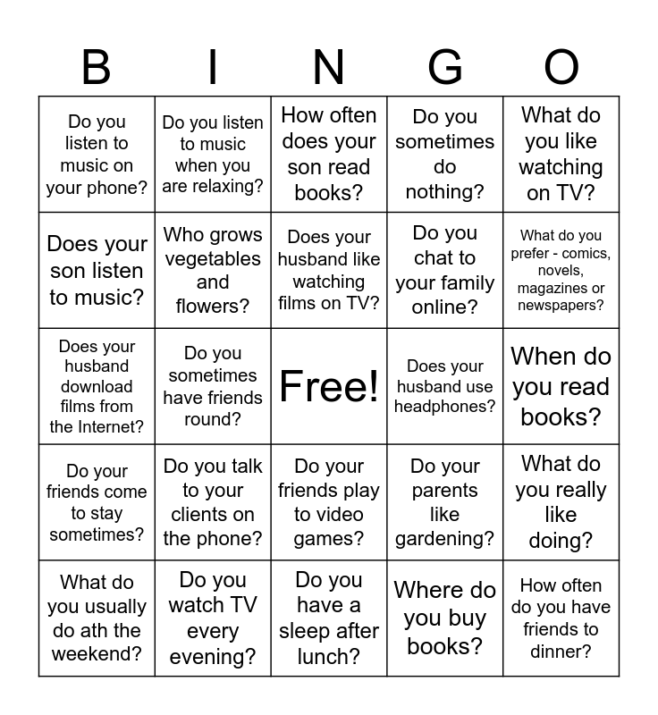 This bingo card has a free space and 24 words: Do you talk to your clients on the phone?, Do you watch TV every evening?, Does your husband like watching films on TV?, What do you usually do ath the weekend?, What do you like watching on TV?, Do you listen to music on your phone?, Does your son listen to music?, Do you listen to music when you are relaxing?, Does your husband use headphones?, Do your friends play to video games?, Do you chat to your family online?, Does your husband download films from the Internet?, Do your parents like gardening?, What do you really like doing?, Who grows vegetables and flowers?, Where do you buy books?, When do you read books?, How often does your son read books?, What do you prefer - comics, novels, magazines or newspapers?, Do you sometimes have friends round?, How often do you have friends to dinner?, Do your friends come to stay sometimes?, Do you sometimes do nothing? and Do you have a sleep after lunch?.