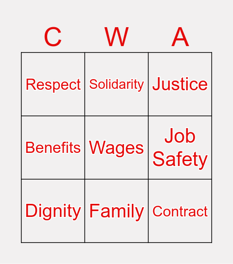 This bingo card has a free space and 8 words: Job Safety, Justice, Solidarity, Dignity, Respect, Contract, Benefits and Family.