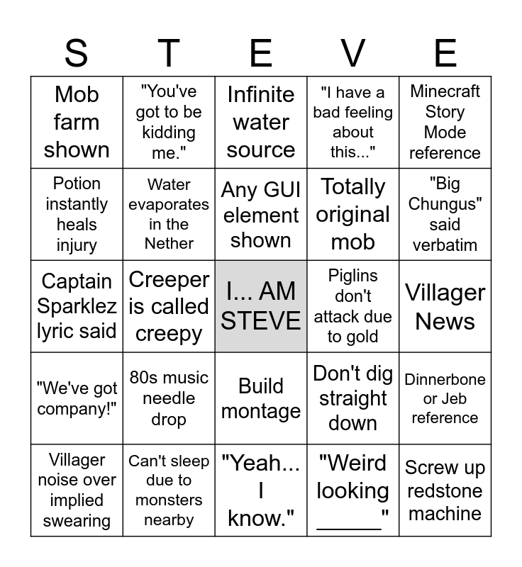 This bingo card has a free space and 71 words: "He's right behind me... isn't he?", "You've got to be kidding me.", 'The End' reference, "That sounded better in my head.", "Yeah... I know.", "All you do is Mine and Craft?", "I have a bad feeling about this...", Jack Black sings, Totally original mob, "Ok guys, here's the plan...", Villager noise over implied swearing, Herobrine, "Big Chungus" said verbatim, Mob farm shown, Command blocks, Captain Sparklez lyric said, Don't dig straight down, Minecraft Story Mode reference, Reference to ongoing SMP, Villager News, 80s music needle drop, Screw up redstone machine, Dinnerbone or Jeb reference, Minecraft mod reference, Tool breaks at unhelpful time, Bed explodes in Nether, Wither appearance, Warden appearance, Ender Dragon appearance, Far Lands, Can't sleep due to monsters nearby, Fan creations in credits, Mob vote loser appearance, "There's too many of them!", "Weird looking _____", Biome name drop, Death fakeout via Totem of Undying, Movie version of structure is way cooler, Potion instantly heals injury, Alex cameo, Build montage, "Well, THAT was awkward!", "We've got company!", Joke about item carry capacity, Gold tools are built but are bad, Bastion appearance, Item destroyed with cactus, Water evaporates in the Nether, "It's hot in here.", "Well, there goes that idea.", Villager trading, Piglin bartering, Piglins don't attack due to gold, Minecraft eating sound when eating, Jennifer Coolidge x Villager romance, Feather falling boots, Any GUI element shown, Enderman appearance, "Right in the ender pearls!", Item doesn't drop due to tool tier, "There's something I haven't told you.", "Nobody move!", Creeper is called creepy, "In English?", 64 item stack reference, Wilhelm scream, Infinite water source, Bone meal instantly grows plant, Sand or gravel falls when placed gag, "Why is it floating?" and Steve / Garrett give pep talk to kid(s).