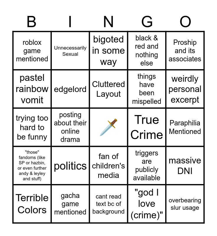 This bingo card has a free space and 24 words: politics, gacha game mentioned, Cluttered Layout, Terrible Colors, Proship and its associates, roblox game mentioned, pastel rainbow vomit, Unnecessarily Sexual, True Crime, fan of children's media, things have been mispelled, trying too hard to be funny, triggers are publicly available, massive DNI, edgelord, "god I love (crime)", Paraphilia Mentioned, bigoted in some way, weirdly personal excerpt, posting about their online drama, overbearing slur usage, "those" fandoms (like SP or hazbin, or even further andy & leyley and stuff), black & red and nothing else and cant read text bc of background.