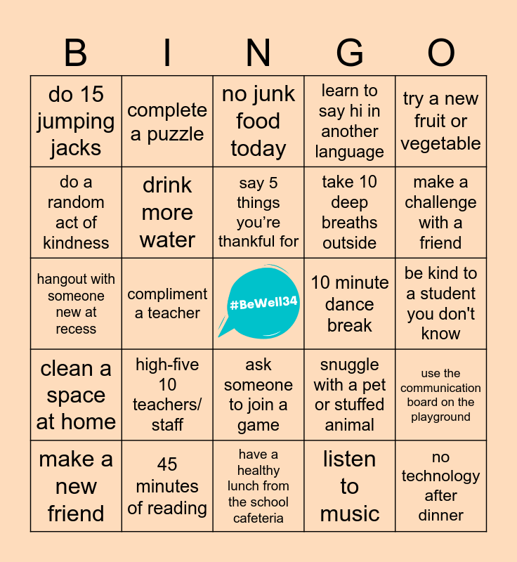 This bingo card has a free space and 24 words: high-five 10 teachers/ staff, 45 minutes of reading, say 5 things you’re thankful for, make a new friend, try a new fruit or vegetable, do 15 jumping jacks, do a random act of kindness, complete a puzzle, 10 minute dance break, ask someone to join a game, take 10 deep breaths outside, hangout with someone new at recess, snuggle with a pet or stuffed animal, use the communication board on the playground, drink more water, listen to music, be kind to a student you don't know, no junk food today, make a challenge with a friend, compliment a teacher, no technology after dinner, clean a space at home, learn to say hi in another language and have a healthy lunch from the school cafeteria.