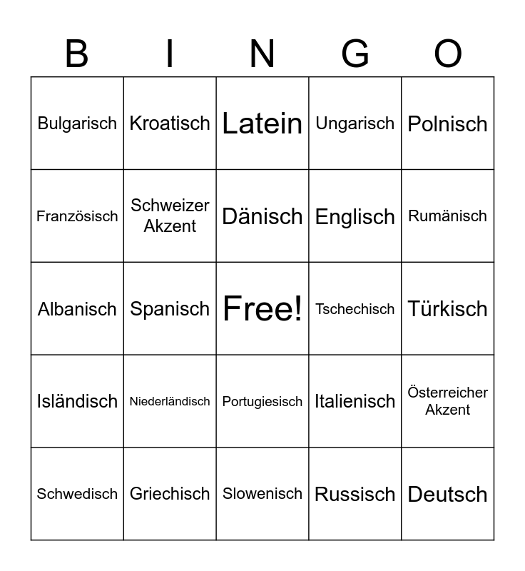 This bingo card has a free space and 24 words: Niederländisch, Griechisch, Dänisch, Schwedisch, Polnisch, Bulgarisch, Französisch, Kroatisch, Tschechisch, Portugiesisch, Englisch, Albanisch, Italienisch, Österreicher Akzent, Schweizer Akzent, Russisch, Türkisch, Latein, Rumänisch, Spanisch, Deutsch, Isländisch, Ungarisch and Slowenisch.
