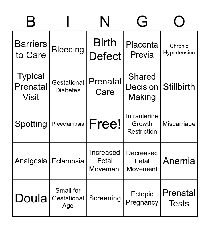 This bingo card has a free space and 24 words: Eclampsia, Small for Gestational Age, Prenatal Care, Doula, Chronic Hypertension, Barriers to Care, Typical Prenatal Visit, Bleeding, Intrauterine Growth Restriction, Increased Fetal Movement, Shared Decision Making, Spotting, Decreased Fetal Movement, Anemia, Gestational Diabetes, Ectopic Pregnancy, Miscarriage, Birth Defect, Stillbirth, Preeclampsia, Prenatal Tests, Analgesia, Placenta Previa and Screening.