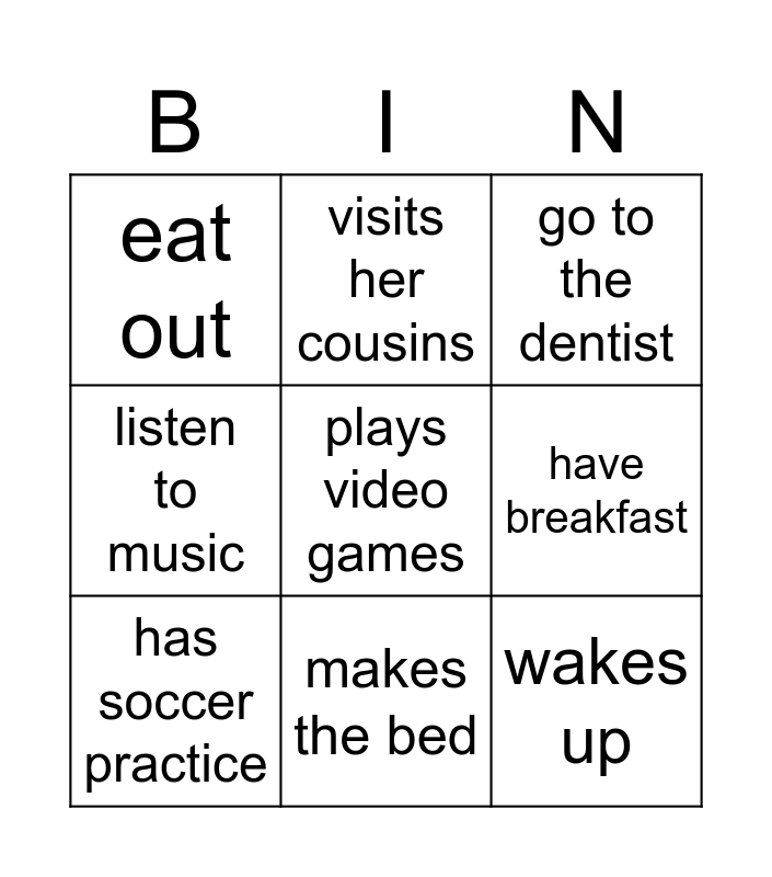 This bingo card has 24 words: go on vacation, feeds the dog, do the dishes, has guitar lesson, wakes up, eat out, visits her cousins, go to the dentist, gets up, get dressed, washes the car, ride a bicycle, read a book, studies math, has soccer practice, watches T V, walks the dog, listen to music, plays video games, draw pictures, takes a shower, makes the bed, have breakfast and go to school.