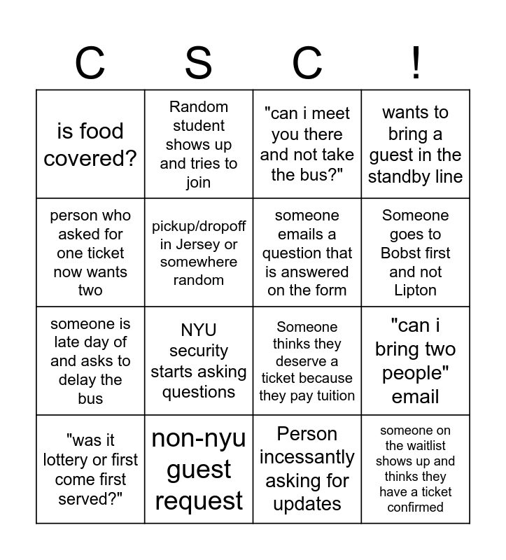 This bingo card has 16 words: non-nyu guest request, "can i bring two people" email, "can i meet you there and not take the bus?", is food covered?, someone is late day of and asks to delay the bus, Random student shows up and tries to join, Someone thinks they deserve a ticket because they pay tuition, Person incessantly asking for updates, person who asked for one ticket now wants two, pickup/dropoff in Jersey or somewhere random, "was it lottery or first come first served?", wants to bring a guest in the standby line, NYU security starts asking questions, Someone goes to Bobst first and not Lipton, someone emails a question that is answered on the form and someone on the waitlist shows up and thinks they have a ticket confirmed.
