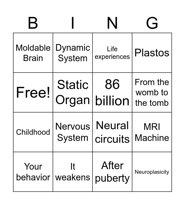 This bingo card has 16 words: It weakens, MRI Machine, Life experiences, Moldable Brain, Childhood, Dynamic System, Neural circuits, After puberty, Free!, Static Organ, Your behavior, Plastos, Nervous System, From the womb to the tomb, 86 billion and Neuroplasicity.