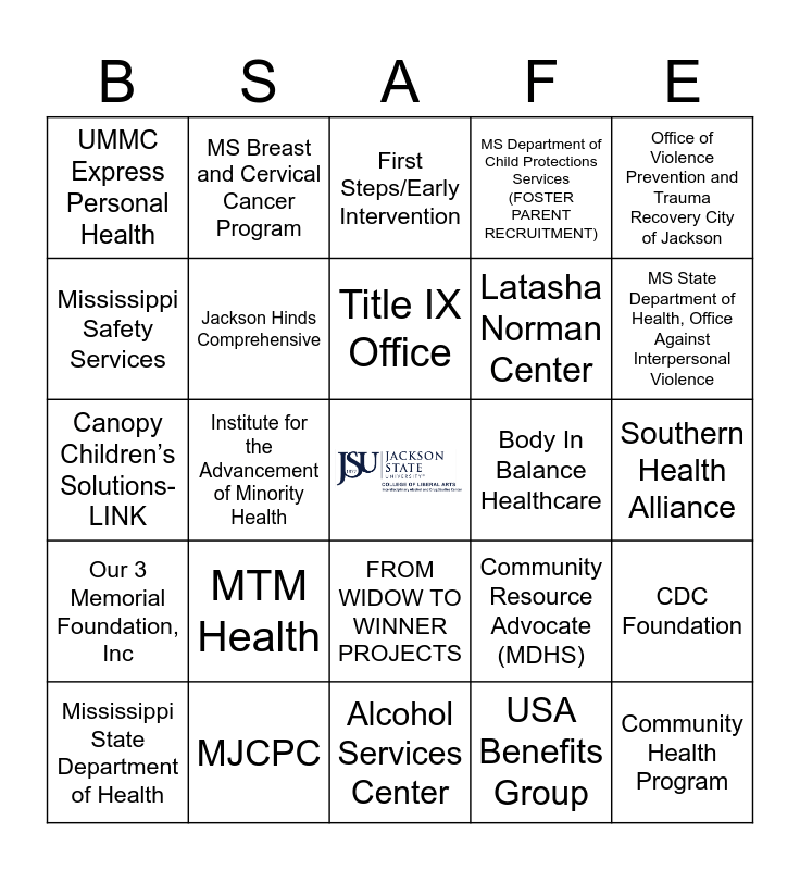 This bingo card has a free space and 24 words: MTM Health, MJCPC, Title IX Office, Mississippi State Department of Health, Office of Violence Prevention and Trauma Recovery City of Jackson, UMMC Express Personal Health, Mississippi Safety Services, MS Breast and Cervical Cancer Program, Body In Balance Healthcare, FROM WIDOW TO WINNER PROJECTS, Latasha Norman Center, Canopy Children’s Solutions-LINK, Community Resource Advocate (MDHS), CDC Foundation, Jackson Hinds Comprehensive, USA Benefits Group, Southern Health Alliance, First Steps/Early Intervention, MS State Department of Health, Office Against Interpersonal Violence, Institute for the Advancement of Minority Health, Community Health Program, Our 3 Memorial Foundation, Inc, MS Department of Child Protections Services (FOSTER PARENT RECRUITMENT) and Alcohol Services Center.