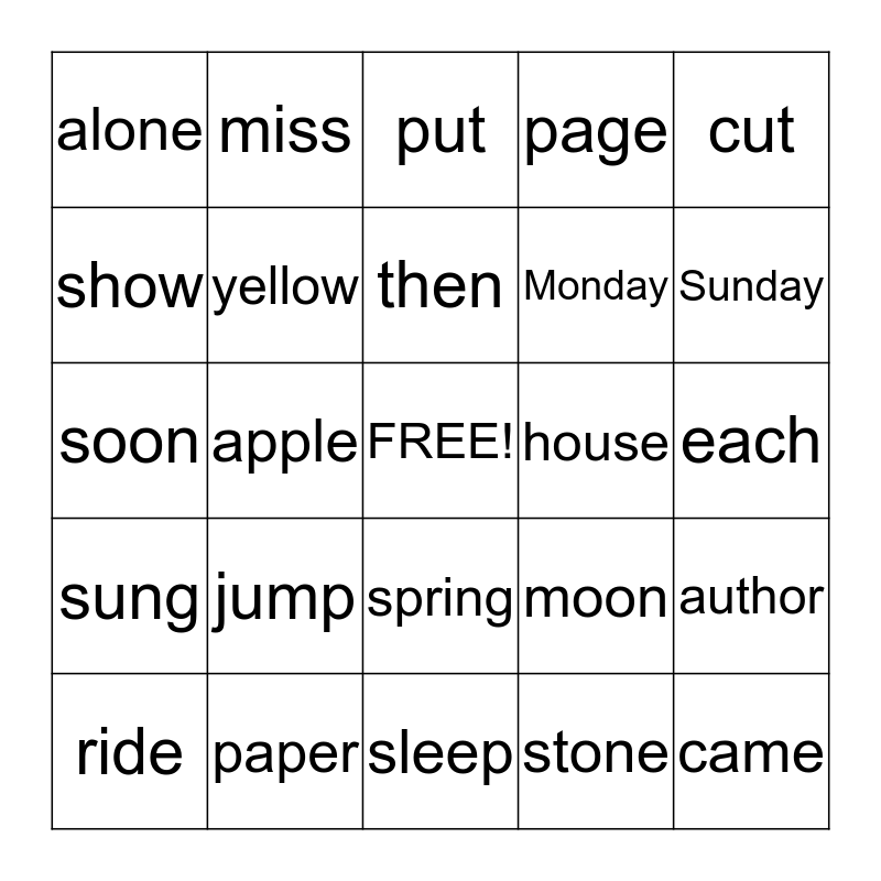 This bingo card has a free space and 24 words: jump, paper, then, ride, cut, alone, show, miss, house, spring, Monday, soon, moon, author, yellow, stone, each, put, Sunday, apple, came, sung, page and sleep.
