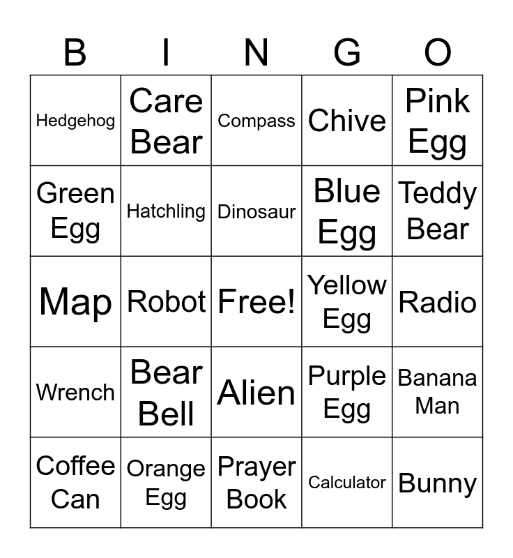This bingo card has a free space and 24 words: Bear Bell, Orange Egg, Dinosaur, Coffee Can, Pink Egg, Hedgehog, Green Egg, Care Bear, Yellow Egg, Alien, Blue Egg, Map, Purple Egg, Banana Man, Hatchling, Calculator, Radio, Compass, Teddy Bear, Robot, Bunny, Wrench, Chive and Prayer Book.