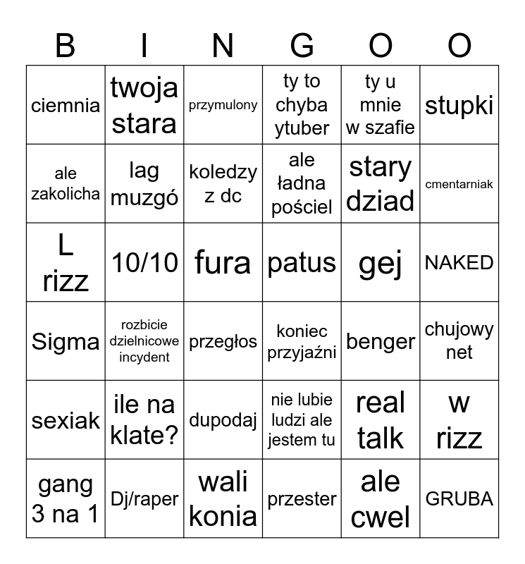 This bingo card has 36 words: Sigma, rozbicie dzielnicowe incydent, wali konia, ale ładna pościel, gej, NAKED, ciemnia, Dj/raper, przymulony, nie lubie ludzi ale jestem tu, stary dziad, stupki, sexiak, 10/10, koledzy z dc, ty to chyba ytuber, real talk, chujowy net, ale zakolicha, lag muzgó, przegłos, koniec przyjaźni, benger, w rizz, L rizz, twoja stara, fura, przester, ty u mnie w szafie, cmentarniak, gang 3 na 1, ile na klate?, dupodaj, patus, ale cwel and GRUBA.