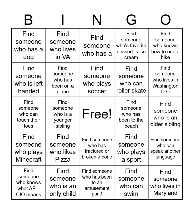 This bingo card has a free space and 24 words: Find someone who likes Pizza, Find someone who is an only child, Find someone who plays soccer, Find someone who knows what AFL-CIO means, Find someone who knows how to ride a bike, Find someone who has a dog, Find someone who is left handed, Find someone who lives in VA, Find someone who has been to the beach, Find someone who has fractured or broken a bone, Find someone who can roller skate, Find someone who can touch their toes, Find someone who plays a sport, Find someone who can speak another language, Find someone who has been on a plane, Find someone who can swim, Find someone who is an older sibling, Find someone who has a, Find someone who lives in Washington D.C, Find someone who is a younger sibling, Find someone who lives in Maryland, Find someone who plays Minecraft, Find someone who's favorite dessert is ice cream and Find someone who has been to an amusement park!.