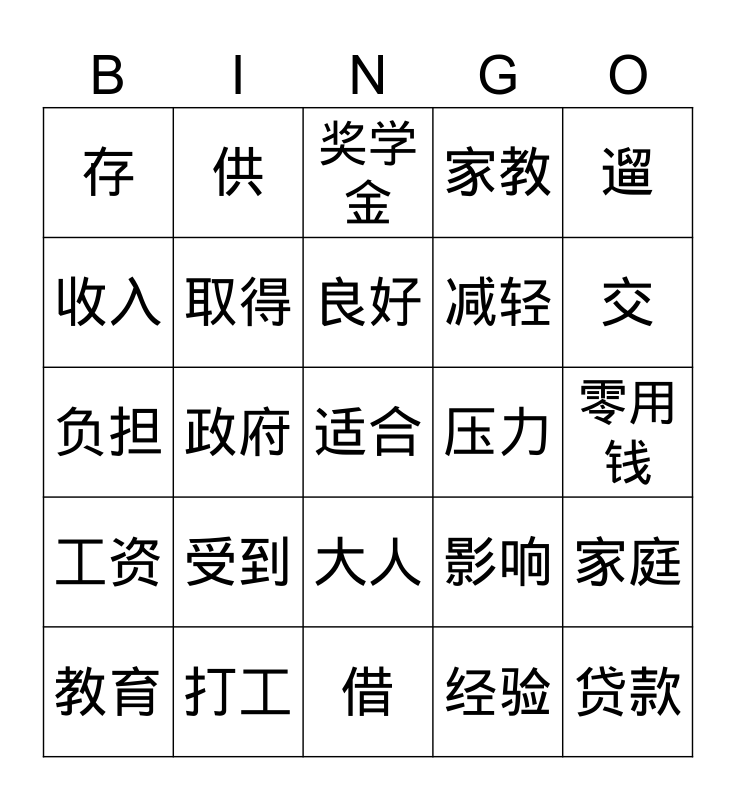 This bingo card has a free space and 24 words: 受到, 打工, 良好, 教育, 遛, 存, 收入, 供, 压力, 大人, 减轻, 负担, 影响, 家庭, 取得, 经验, 零用钱, 奖学金, 交, 政府, 贷款, 工资, 家教 and 借.