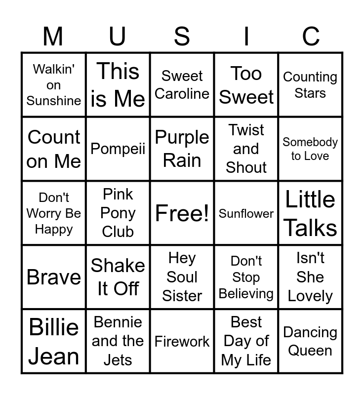 This bingo card has a free space and 24 words: Shake It Off, Bennie and the Jets, Purple Rain, Billie Jean, Counting Stars, Walkin' on Sunshine, Count on Me, This is Me, Sunflower, Hey Soul Sister, Twist and Shout, Don't Worry Be Happy, Don't Stop Believing, Isn't She Lovely, Pompeii, Best Day of My Life, Little Talks, Sweet Caroline, Somebody to Love, Pink Pony Club, Dancing Queen, Brave, Too Sweet and Firework.