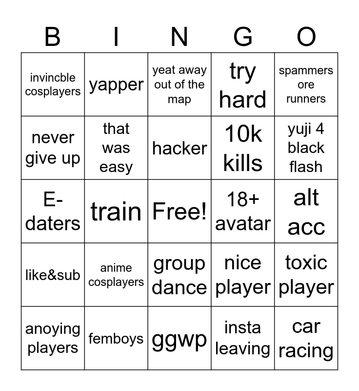 This bingo card has a free space and 24 words: anime cosplayers, femboys, hacker, anoying players, spammers ore runners, invincble cosplayers, never give up, yapper, 18+ avatar, group dance, 10k kills, E-daters, nice player, toxic player, that was easy, insta leaving, alt acc, yeat away out of the map, yuji 4 black flash, train, car racing, like&sub, try hard and ggwp.