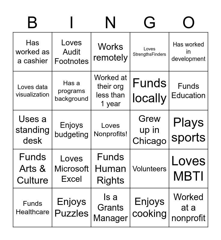 This bingo card has a free space and 49 words: Is on a Board, Worked at a nonprofit, Is a Program Officer, Is a Grants Manager, Loves Microsoft Excel, Loves the IRS Form 990, Loves Audit Footnotes, Has a finance background, Loves data visualization, Has a performance background, Has a programs background, Loves StrengthsFinders, Loves MBTI, Volunteers, Is a Board Treasurer, Did not grow up in Illinois, Worked at their org less than 1 year, Grew up in Chicago, Has worked at an org for 10+ years, Has worked in development, Enjoys budgeting, Enjoys cooking, Has worked as a cashier, Funds locally, Funds Nationally, Funds Education, Funds Healthcare, Funds Environmental Justice, Funds Human Rights, Funds Arts & Culture, Funds LGBTQIA+ Justice, Funds Reproductive Justice, Hates Math, Is left-handed, Enjoys Puzzles, Is an avid reader, Went camping in the last year, Wears jeans to work, Plays sports, Shares your birthday month, Has 3 or more siblings, Has had an "uncommon" pet, Enjoys crafting, Loved statistics, Uses a standing desk, Works remotely, Plays an instrument, Speaks more than 2 languages and Takes notes by hand.
