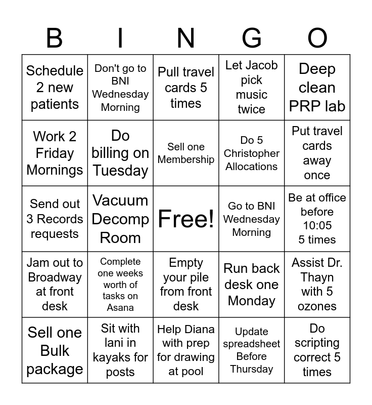 This bingo card has a free space and 24 words: Complete one weeks worth of tasks on Asana, Sit with lani in kayaks for posts, Sell one Membership, Sell one Bulk package, Deep clean PRP lab, Schedule 2 new patients, Work 2 Friday Mornings, Don't go to BNI Wednesday Morning, Go to BNI Wednesday Morning, Empty your pile from front desk, Do 5 Christopher Allocations, Send out 3 Records requests, Run back desk one Monday, Assist Dr. Thayn with 5 ozones, Do billing on Tuesday, Update spreadsheet Before Thursday, Be at office before 10:05 5 times, Pull travel cards 5 times, Put travel cards away once, Vacuum Decomp Room, Do scripting correct 5 times, Jam out to Broadway at front desk, Let Jacob pick music twice and Help Diana with prep for drawing at pool.