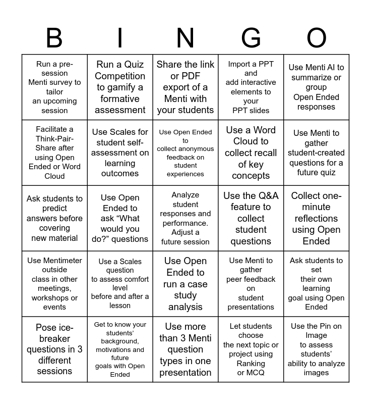 This bingo card has 25 words: Use a Scales question to assess comfort level before and after a lesson, Use more than 3 Menti question types in one presentation, Use Open Ended to collect anonymous feedback on student experiences, Pose ice-breaker questions in 3 different sessions, Use Menti AI to summarize or group Open Ended responses, Run a pre-session Menti survey to tailor an upcoming session, Facilitate a Think-Pair- Share after using Open Ended or Word Cloud, Run a Quiz Competition to gamify a formative assessment, Use the Q&A feature to collect student questions, Use Open Ended to run a case study analysis, Use a Word Cloud to collect recall of key concepts, Ask students to predict answers before covering new material, Use Menti to gather peer feedback on student presentations, Ask students to set their own learning goal using Open Ended, Use Scales for student self- assessment on learning outcomes, Use the Pin on Image to assess students’ ability to analyze images, Collect one-minute reflections using Open Ended, Share the link or PDF export of a Menti with your students, Use Menti to gather student-created questions for a future quiz, Use Open Ended to ask “What would you do?” questions, Analyze student responses and performance. Adjust a future session, Get to know your students’ background, motivations and future goals with Open Ended, Use Mentimeter outside class in other meetings, workshops or events, Import a PPT and add interactive elements to your PPT slides and Let students choose the next topic or project using Ranking or MCQ.