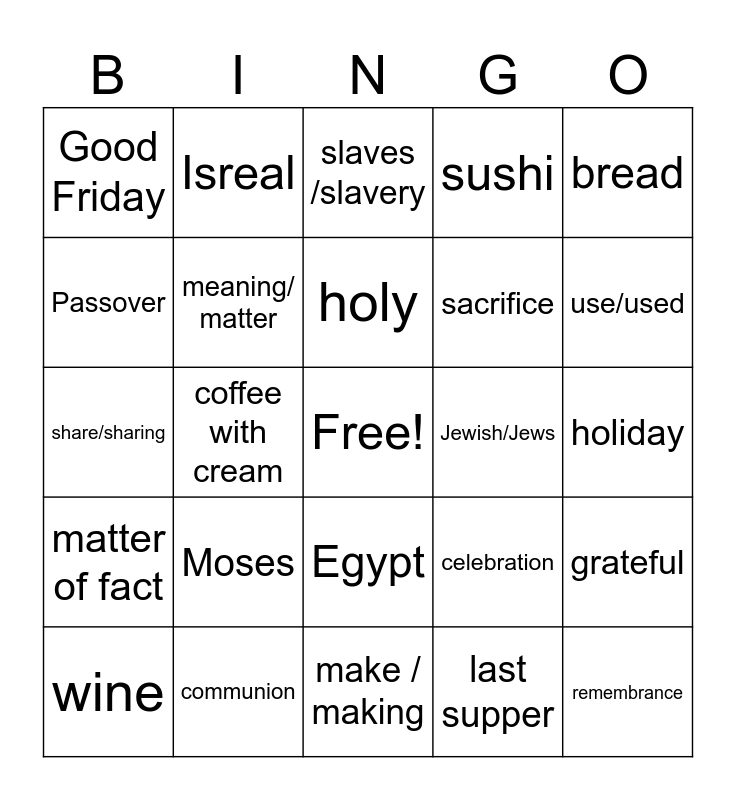 This bingo card has a free space and 24 words: Moses, communion, holy, wine, bread, Good Friday, Passover, Isreal, Jewish/Jews, Egypt, sacrifice, share/sharing, celebration, grateful, meaning/ matter, last supper, holiday, slaves /slavery, use/used, coffee with cream, remembrance, matter of fact, sushi and make / making.