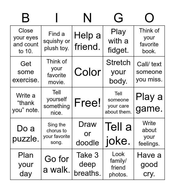 This bingo card has a free space and 24 words: Sing the chorus to your favorite song., Go for a walk., Color, Plan your day, Think of your favorite book., Close your eyes and count to 10., Get some exercise., Find a squishy or plush toy., Tell someone your care about them., Draw or doodle, Stretch your body., Write a “thank you” note., Tell a joke., Write about your feelings., Think of your favorite movie., Look family/ friend photos., Play a game., Help a friend., Call/ text someone you miss., Tell yourself something nice., Have a good cry., Do a puzzle., Play with a fidget. and Take 3 deep breaths..
