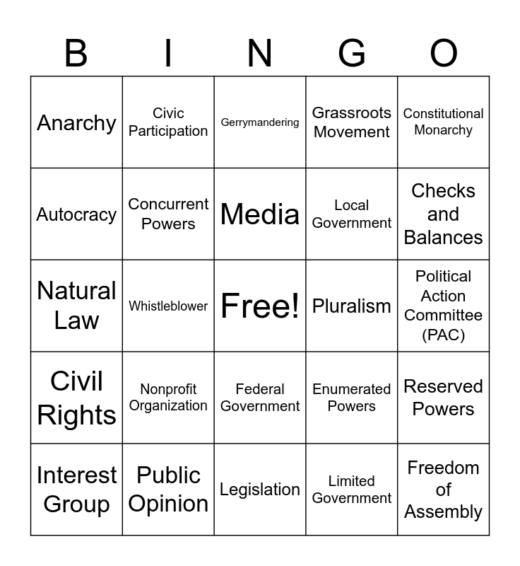 This bingo card has a free space and 24 words: Nonprofit Organization, Public Opinion, Media, Interest Group, Constitutional Monarchy, Anarchy, Autocracy, Civic Participation, Pluralism, Federal Government, Local Government, Natural Law, Enumerated Powers, Reserved Powers, Concurrent Powers, Limited Government, Political Action Committee (PAC), Gerrymandering, Checks and Balances, Whistleblower, Freedom of Assembly, Civil Rights, Grassroots Movement and Legislation.